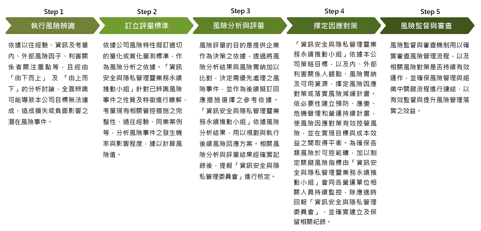 本公司為實踐企業永續發展之願景並建立具備風險意識的企業文化,除遵循各層級的組織管理制度及營運作業流程下的相關風險管理措施,並承諾藉由高階經理人的參與,持續精進本公司的相關風險管理作為。
